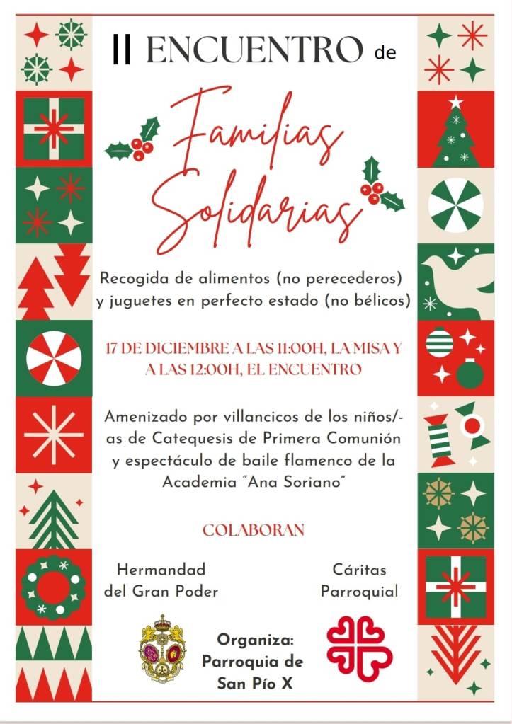 En la parroquia San Pío X de Almería, tras la Eucaristía del cuarto domingo de Adviento, se celebró el I Encuentro de Familias Solidarias en el barrio del Zapillo. Con ayuda de Cáritas y la Cofradía del Gran Poder, se recogieron alimentos no perecederos y juguetes para familias necesitadas. El evento incluyó la participación de niños y niñas de catequesis que cantaron villancicos y una academia de baile que presentó un villancico flamenco… Continuar leyendo