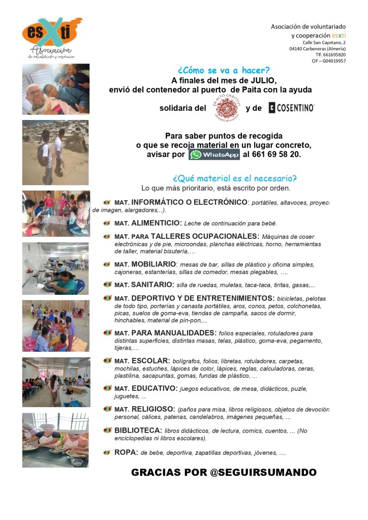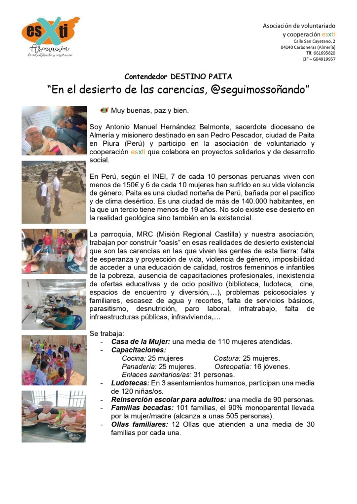 Desde la Parroquia San Pío X colaboramos con la Asociación de Voluntariado y Cooperación ESXTI en el proyecto “Destino Paita”, cuyo fin es enviar ayuda humanitaria a la ciudad de Paita (Perú), donde actúa el misionero Don Antonio Manuel Hernández, sacerdote de Almería. Allí se trabaja en zonas marcadas por la pobreza, la violencia de género y la falta de oportunidades educativas, especialmente entre mujeres y niños.